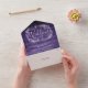 All in one wedding invitation featuring a hand-drawn floral garland and chic typography on a purple rustic wood panels background. The invitation includes a perforated RSVP card that can be individually addressed or left blank for you to handwrite your guest's address details. Designed by Thisisnotme©
