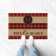 Fun doormat with contemporary black and red checkered plaid pattern on burlap background. Stylish rustic unique design with room to customize or personalize with your family name monogram. Original personalized monogrammed outdoor decor accent for decorating the front porch or yard of your country cottage house, log cabin, mountain lodge, fishing camp, lake or river vacation home.