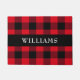 This lumberjack style red and black buffalo check pattern doormat has a black strip across the center with a family name in white text. Personalize with your own name or to give as a gift.