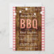 Invite guests to celebrate Father's Day with a rustic BBQ invitation. This BBQ invitation features rustic wood on red and white gingham background, mason jar string lights, and red marquee BBQ letters. Perfect for your backyard BBQ. Easy to customize with your specific party details.