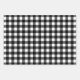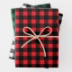 Rustic modern gift wrap set features three buffalo check holiday wrapping paper sheets in bright red and black buffalo plaid, black and white buffalo plaid, and emerald green and black buffalo plaid patterns.