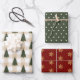 A collection of coordinated holiday wrapping papers. One features a beige gingham background with a green Christmas tree pattern, the second is a burnt red background with a gold snowflake and the third is a coordinating green with a beige polka dot.
