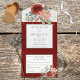 ALSO AVAILABLE WITH A QR CODE TO SCAN. This beautiful soft marsala red, blush pink, light blue and green bouquet cascades from the top of the card over a rich red background, speckled with gold. Beautiful, elegant, and rustic. Personalized All-In-One invitations are a unique combination of both a beautifully printed custom invitation with an easy to tear off perforated RSVP postcard. And they are so easy to use! You simply fold, then seal the back flap with the three included clear stickers, and mail. And when your guests receive your custom invite, they just tear the perforated RSVP Card off and drop it back in the mail to you!