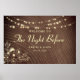Welcome your guests in style with this rustic rehearsal dinner sign featuring glowing string lights, wood grain texture, and elegant floral details. A charming way to set the tone for your night-before celebration.