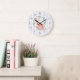 A clock with a digital watercolor design. A pastel orange reindeer silhouette inside a wreath of herbal leaves. Mushrooms and forest ferns at his feet.
