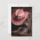 A beautifully composed image capturing the essence of a country wedding, featuring a pair of finely detailed brown cowboy boots paired with a soft rose-colored cowboy hat. Set against a rugged leather backdrop; also a leather texture on the back of the card, the scene evokes charm, tradition, and western elegance—perfect for the modern bride or groom who’s bringing a little country flair to their big day.