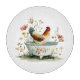 This whimsical watercolor pairing features a chicken nestled in a floral bowl and a regal rooster perched on a white picket fence, each surrounded by vibrant blooms. The chicken’s red comb and mottled feathers contrast playfully with soft daisies and wildflowers, while the rooster’s fiery plumage and green tail command attention amid foxgloves and warm-toned blossoms. Together, they blend rustic charm and storybook flair in a cozy, nature-kissed composition.