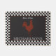 Show your family pride right at your front door with this rustic black, rusty red and white monogram door mat design featuring a black and white check border with a dark red rooster in center. Personalize with your family name and year established. Design by Holiday Hearts Designs (rights reserved).