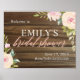 Personalized bridal shower welcome sign featuring pink watercolor flowers and a faux wood texture background