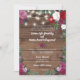 Hanging fairy or string lights are strung across a faux wood plank background. Bouquets of roses in white, red, and pink and greenery done in a watercolor effect make a striking border on this wedding invitation. Available with matching products.