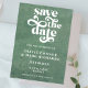 With a simple and modern design and retro typography, this elegant save-the-date announcement fits any wedding theme. It features a modern rustic sage green background and and minimalist and simple typography.