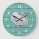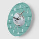 Goes beautiful with my beach theme room. The color is perfect, the hands stand out so you can tell the time so easy. I personalized this clock. The printing came out perfect. I had it done in black and the font is pretty. Shows up very nice on the clock.