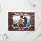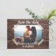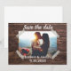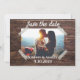 Save the Date Photo Card with dark wood background and white font. Picture has the effect of being taped onto the wood with tape. Simply swap the picture out with your photo and edit the names and the date for your special day. As easy as that!