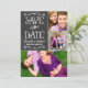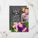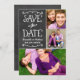 Whimsical and unique two-sided photo collage announcement card save the dates feature a rustic textured look blackboard background with handwritten style fonts that have a white chalk appearance. Personalize with the wedding details and three (3) favorite engagement photos.