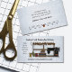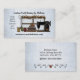 Prim rustic business card for sewing and quilting artisans with cutely detailed graphics scene of a vintage sewing machine, stacks of fabric, scissors and thread in front of a widow. Created on a gmottled light blue vintage look background in part with purchased art from digiwebstudio.com. Customize all text in the simple online Zazzle form.