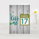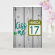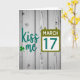 This St. Patrick's Day card features a rustic background of desaturated wooden planks with visible knots and vertical grain, setting a cozy, down-to-earth scene. On the left, the words “kiss me” appear in flowing teal lettering, like a sweet nudge between close friends or a couple leaning in with a grin 💚. A bright green three-leaf shamrock sits nearby, adding a lucky touch that feels like a small shared secret ☘️. On the right, a calendar icon in olive green balances the layout and gives the design a tidy structure. Inside the calendar, “MARCH 17” is placed prominently in teal, centered so it stands out at a glance. The cool teal and earthy greens sit softly against the muted wood, guiding your eye from the flirty phrase to the date. The final detail is the weathered timber texture, with subtle color shifts and grain lines running straight down behind the teal text and green icons.