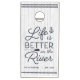 Upgrade your outdoor setup at your forest abode with this cute rustic cornhole set featuring the phrase "life is better on the river" in navy blue lettering accented with an anchor and an oar, on a faux shiplap wood plank background. Personalize with your family name and/or year established beneath.