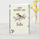 Designed with a soft, cozy illustration style, this card centers on a calm little bird in warm brown and creamy beige tones, perched on a thin branch that curves across the upper middle. Small green leaves and white blossoms with tiny yellow centers cluster along the branch, and the bird’s relaxed posture suggests a quiet closeness, like a gentle moment shared between family members ❤️. Near the top, the text “HAPPY MOTHER’S DAY” sits in an earthy brown, simple sans-serif style, spaced neatly above the branch. Lower down, the word “Sister” appears in the same brown color in a flowing, cursive-like lettering, placed as a second line beneath the main greeting. The background is off-white with a faint paper-like texture that keeps the scene soft and calm. A matching blossom with two leaves rests in the lower-left corner, adding a small touch of balance 🌼. The border looks slightly rough and torn, like aged paper edges framing the artwork.