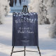 Chic rustic bridal shower sign foam board with white snowflakes and twinkle string lights on a navy blue barn wood background. Ideal for your winter country rustic mountains seasonal wonderland-themed bridal showers.
