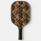Warm geometric stripe pattern pickleball paddle featuring tribal-inspired diamonds, zigzags, and textured vertical bands in earthy brown, terracotta, tan, beige, and charcoal tones. A cozy boho design ideal for southwestern décor lovers, rustic style fans, and anyone drawn to earthy, handcrafted aesthetics.