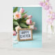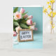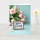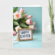 This design shows a rustic burlap-edged sign in the foreground, framing a smooth white panel that feels like a sweet note left for someone special. Centered on that white panel is a clear two-word Easter greeting in dark lettering, standing out crisply against the light surface. Behind it, a soft-focus bouquet drifts into the background, with blush pink and creamy ivory flowers that seem to lean toward each other like close friends 🌷. One bloom shows a gentle golden center, while small flashes of fresh green leaves peek through the petals like quiet hints of spring 🐇. The setting is an open aqua backdrop that keeps the scene airy and calm, letting the pastel colors feel tender rather than loud. Light falls softly across the textures, from the woven border to the silky petals and the smooth sign face. A narrow white ribbon trails from the lower edge of the sign, curling lightly across the surface.