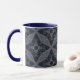 With the rich tones of aged wood, stone, and weathered rooftops, this mug features a kaleidoscopic starburst pattern made from architectural textures. Muted browns, deep greens, slate grays, and sky blues form a rustic yet structured mandala that feels both handcrafted and geometric. The deep navy interior and handle create a calming contrast, perfect for quiet mornings, cozy cabins, or those who love natural textures and symmetry.