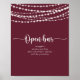 This rustic string lights burgundy wedding open bar poster is perfect for a classic wedding. The design features beautiful hand-painted string lights in a burgundy background.