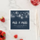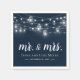 Affordable custom printed paper napkins for your wedding or any event. The design features rustic glowing string lights and mason jars hanging across the top with a mix of modern and calligraphy script fonts on a navy blue background. Personalize it with your Mr. and Mrs. monogram and wedding date or other custom text. Use the design tools to choose any background color, edit the text fonts and colors or upload your own photos.