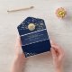 Create a magical first impression with this elegant all-in-one winter wedding invitation. Featuring a rich navy wood background, soft glowing string lights, and golden floral illustrations, this design sets the tone for a romantic, cozy celebration. Includes RSVP details with a QR code for convenience, and folds into a chic, matching envelope. Perfect for barn weddings, winter ceremonies, or rustic evening events.