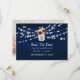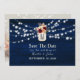 Announce your wedding in style with this rustic Save the Date card, featuring romantic string lights, a navy wood background, and a floral mason jar monogram. A perfect match for barn, country, or fall weddings.