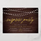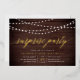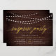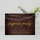 Our festive surprise party invitations feature a rustic wood plank background with strings of glowy white lights across the top, and "surprise party" in chic gold foil calligraphy script typography. Personalize with your surprise celebration details beneath in white; can be used for any occasion, like birthday parties or anniversary parties.