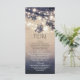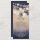 Beautiful country rustic wedding menu cards with string lights hanging on the tree branches.