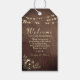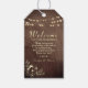 Warmly welcome your guests with these elegant rustic wedding gift tags featuring wood texture, soft string lights, and gold floral illustrations. Perfect for hotel welcome bags, out-of-town guest gifts, or destination weddings.