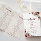 This rustic summer floral folded wedding program is perfect for a simple wedding. The design features burgundy, pink and blush watercolor flowers with green leaves in a brownish stained background.