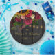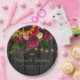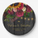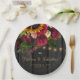 Personalized wedding paper plates featuring a rustic big beautiful yellow sunflowers and red burgundy roses bouquet and faux gold calligraphy script on a dark brown barn wood background with string lights. Ideal for your summer or autumn fall elegant rustic country outdoor backyard vintage traditional themed weddings. Personalize it with the bride's and groom's names and wedding details!