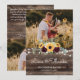 Express your thanks with this rustic sunflower wood wedding thank you card. The design features beautiful watercolor yellow sunflowers and burgundy red roses with string lights on a rustic barn wood background. Personalize with two photos, your names and personal message.
