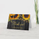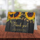 Rustic elegant wedding stylish thank you template card on dark brown barn wood background featuring beautiful sunflower bouquets. +++++++++++++++++++ Suitable for elegant summer or autumn fall rustic countryside farmhouse barn garden backyard weddings.