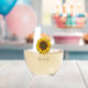 Boho floral Yellow Sunflower bloom stemless wine glass, with customizable script typography. Enjoy this personalized accessory item for yourself or as a gift for someone special.
