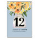 Elements: Lovely portrait of sunflowers in a rustic vase. Your names and details appear in a fun, slightly distressed font. Colors: Yellow, black, brown, orange, green, blue, violet. Themes: rustic, country, barn, romantic, garden, cottage, bright, sunny. Collection: Rustic Sunflower Bouquet Watercolor Wedding Collection. Product Type: Table Card