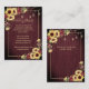 This trendy rustic wedding invitation details card design features warm, trendy sunflower and burgundy watercolor floral design, featuring a burgundy wood background, sweet string lights. Three text fields allow the addition of the information you need to give, with another field on the back, if more information is needed (delete text if you don't need to use this field). Part of a matching wedding set. Copyright Elegant Invites. All rights reserved. Contact designer for matching products.