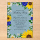 Rustic country birthday invitation featuring vibrant sunflowers, traditional white daisies and navy blue flowers against a blue background with baby's breath and botanical greenery accents