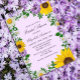Rustic country bridal shower invitation featuring vibrant sunflowers, traditional white daisies and colorful purple flowers against a light purple background with baby's breath and botanical greenery accents