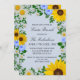 Rustic country Easter invitation featuring vibrant sunflowers, traditional white daisies and colorful blue flowers against a light dusty blue background with baby's breath and botanical greenery accents