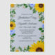 Rustic country graduation invitation featuring vibrant sunflowers, traditional white daisies and colorful blue flowers against a light dusty blue background with baby's breath and botanical greenery accents