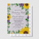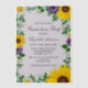 Rustic country graduation invitation featuring vibrant sunflowers, traditional white daisies and colorful purple flowers against a light purple background with baby's breath and botanical greenery accents