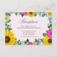 Rustic country wedding invitation featuring vibrant sunflowers, traditional white daisies and pink flowers against a light pink background with baby's breath and botanical greenery accents