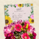 Rustic country wedding RSVP featuring vibrant sunflowers, traditional white daisies and pink flowers against a light pink background with baby's breath and botanical greenery accents
