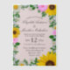Rustic country wedding invitation featuring vibrant sunflowers, traditional white daisies and pink flowers against a light pink background with baby's breath and botanical greenery accents