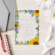 Rustic country wedding invitation featuring vibrant sunflowers, traditional white daisies and light blue flowers with baby's breath and botanical greenery accents