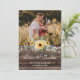 Express your thanks with this rustic sunflower eucalyptus wood wedding thank you card. The design features beautiful watercolor yellow sunflowers and eucalyptus with string lights on a rustic barn wood background. Personalize with two photos, your names and personal message.